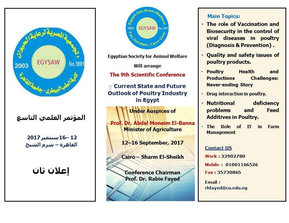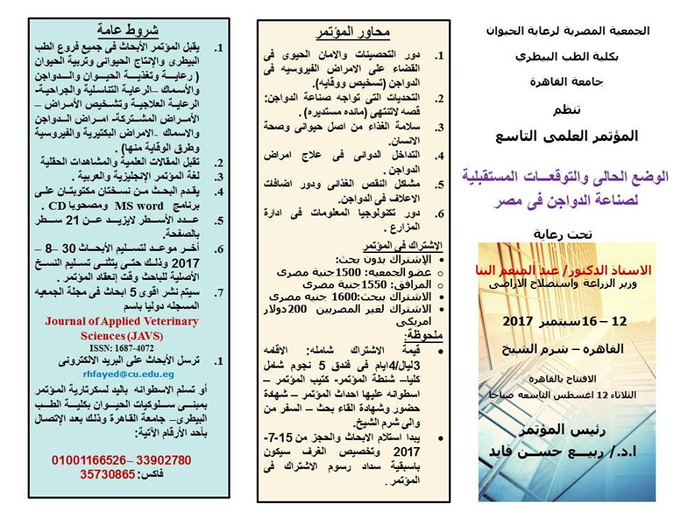 المؤتمر التاسع للجمعية المصرية لرعاية الحيوان تحت عنوان" الوضع الحالي والتوقعات المستقبلية لصناعة الدواجن في مصر