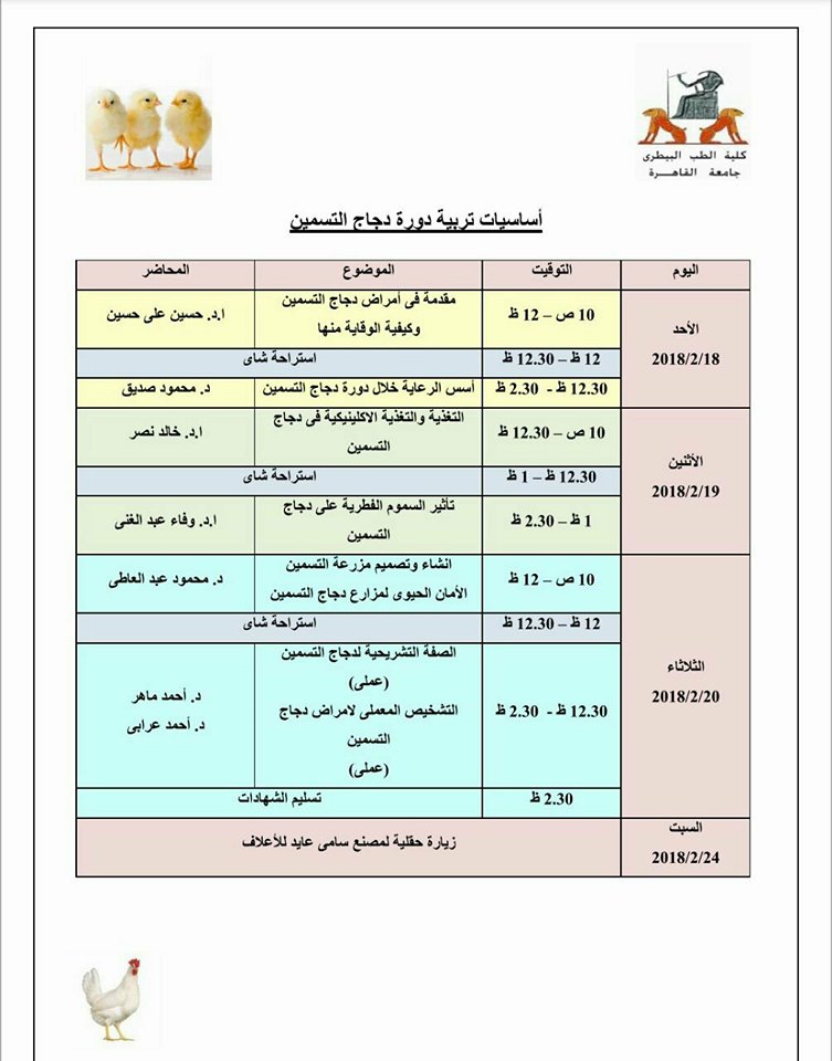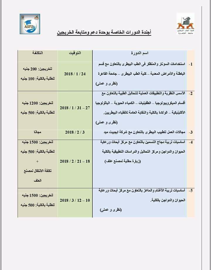 جدول الدورة التدريبية الخاصة بوحدة دعم الخريجين بالتعاون مع مركز تحاليل ووحدة البيوتكنولوجي لكلية الطب البيطري-جامعة القاهرة