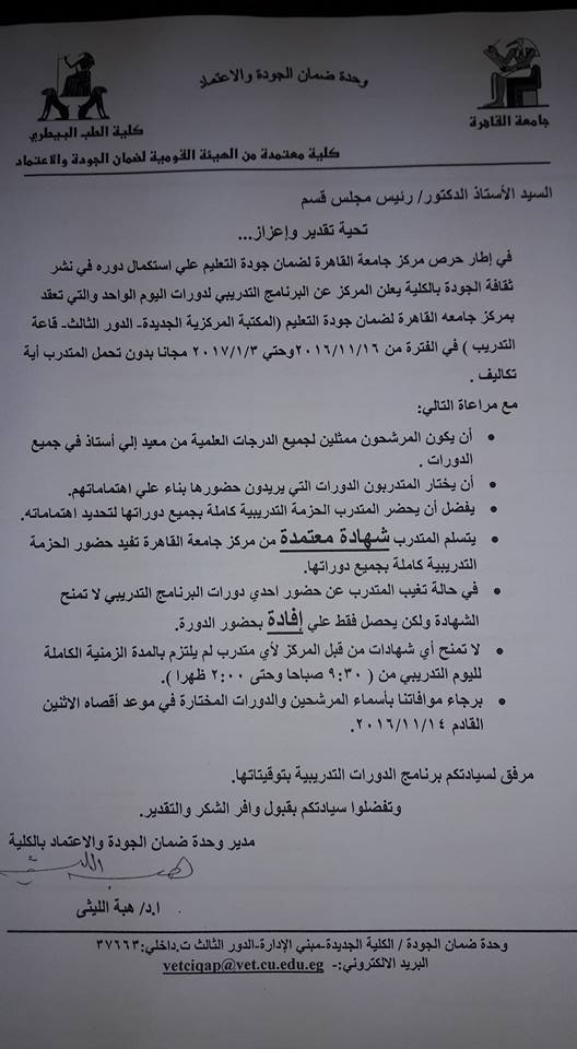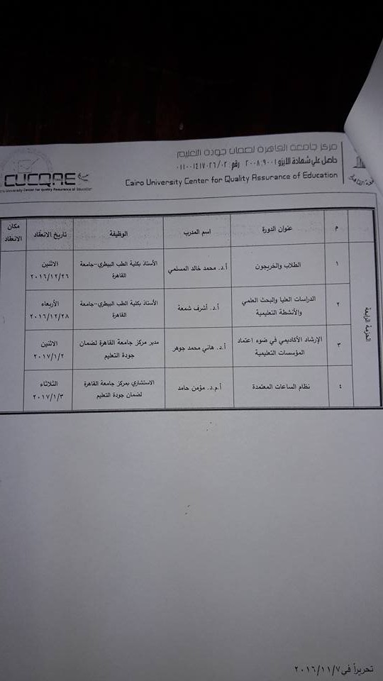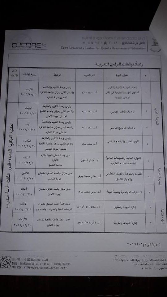 فى اطار حرص مركز جامعه القاهره لضمان جوده التعليم والاعتماد على استكمال دوره فى نشر ثقافه الجوده....يعلن المركز عن البرنامج التدريبي لدورات اليوم الواحد والتى تعقد بمقر المركز فى الفتره من 16 نوفمبر وحتى 3 يناير 2017...مجانا...بدون تحمل المتدرب ايه تكاليف..