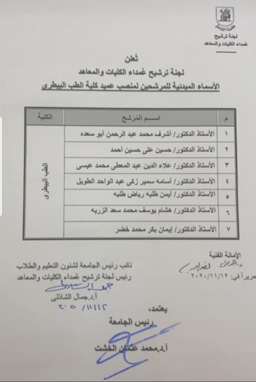 اسماء المرشحين لعمادة كلية الطب البيطرى. جامعة القاهرة