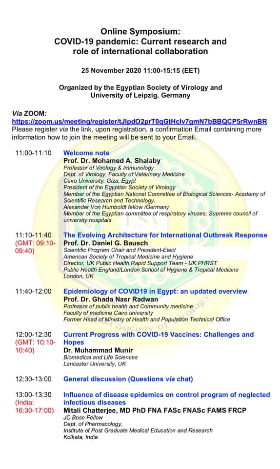 تقيم الجمعية المصرية للفيروسات ندوة دولية عن فيروس الكورونا المستجد و المسبب لمرض الكوفيد-١٩ و ذلك يوم الأربعاء الموافق ٢٥ نوفمبر ٢٠٢٠ (من الساعة ١١ صباحا وحتى الساعة ٣ عصرا) عبر تطبيق زووم . وسوف يشارك في فاعليات الندوة متحدثين من مصر و المانيا وبريطانيا و الصين و الهند و كينيا. و قد تفضلت ادارة الكلية بتخصيص قاعة السيمنار بالدور الثالث بمبني الإدارة لنقل فاعليات الندوة لمن يرغب من سيادتكم في الحضور.