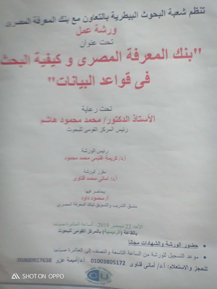 اعلان عن ورشة عمل عن بنك المعرفة المصرى بالمركز القومى للبحوث