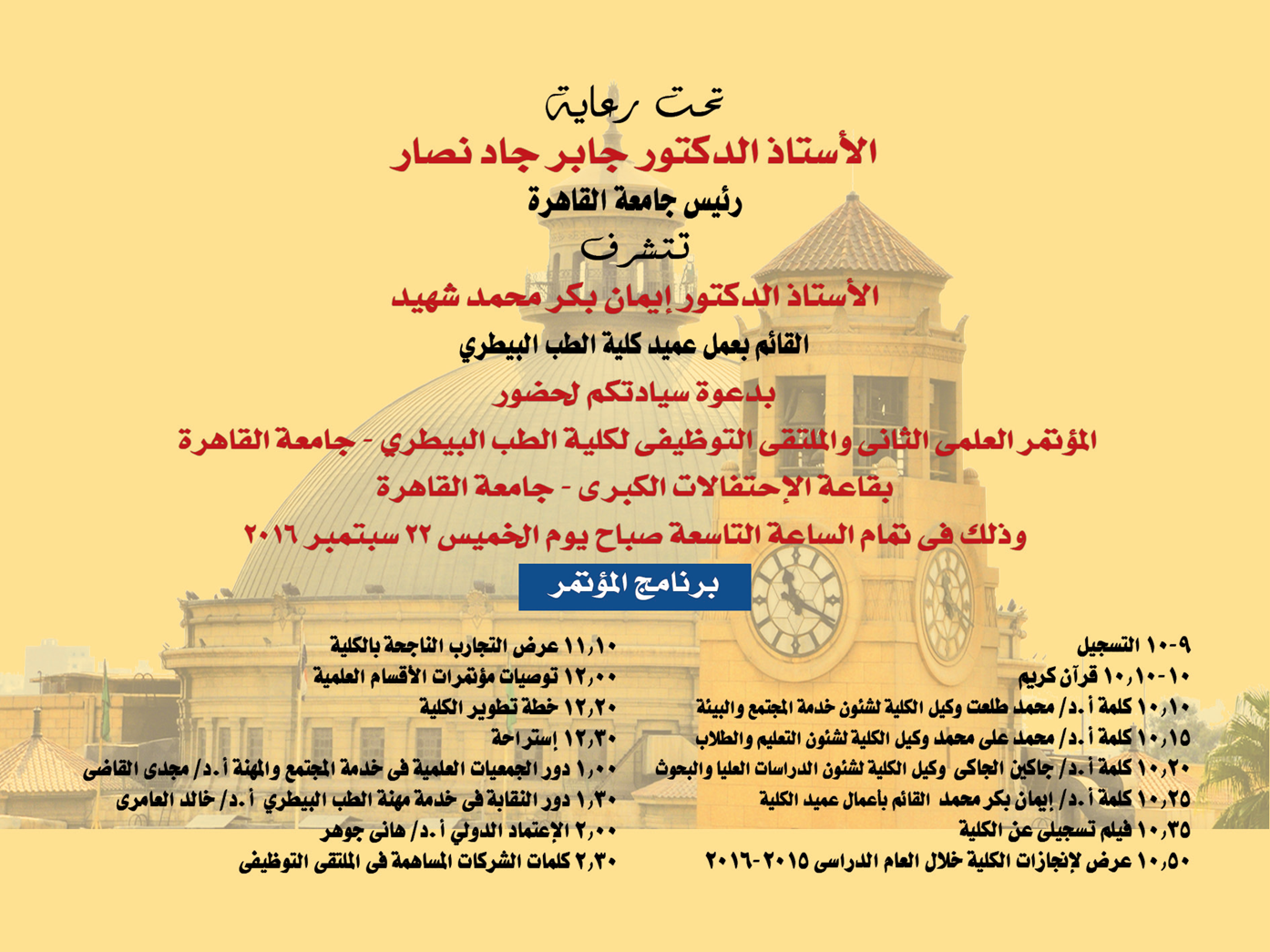 سوف يعقد المؤتمر العلمى الثانى و الملتقى التوظيفى لكلية الطب البيطري-جامعة القاهرة يوم الخميس الموافق 22 سبتمبر 2016 من الساعة التاسعة صباحا و حتى الثالثة عصرا و ذلك بقاعة الإحتفالات الكبرى بجامعة القاهرة
