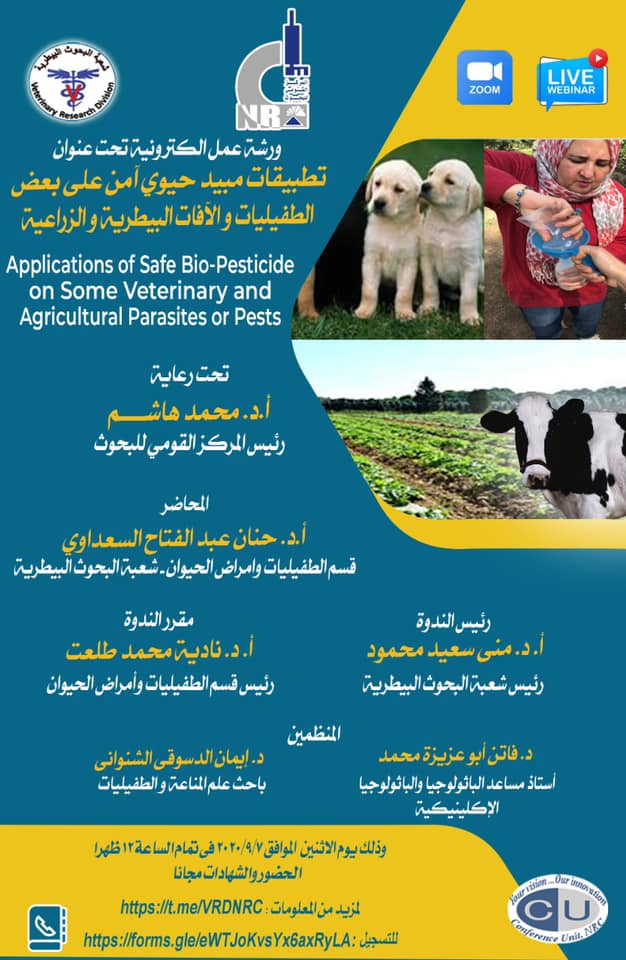 تتشرف شعبة البحوث البيطرية بالمركز القومى للبحوث بدعوة سيادتكم لحضور ورشة عمل الكترونية تحت عنوان: تطبيقات مبيد حيوي آمن على بعض الطفيليات و الآفات البيطرية و الزراعية