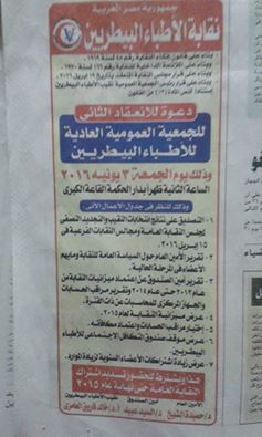 دعوة لحضور الجمعية العمومية للسادة أعضاء النقابة العامة للأطباء البيطريين يوم الجمعة الموافق 3 يونية 2016 الساعة الثانية ظهرا نظرا لعدم إكتمال النصاب القانونى لعقد الجمعية العمومية فى المرة السابقة.......برجاء الحضور لدعم مجلس إدارة النقابة الجديد و مساندتة أمام الحكومة و الرأى العام المصرى.....